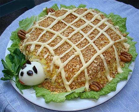 Этот салат отличается от всех остальных оригинальностью оформления, но при этом доступен и прост. Из обычных продуктов выходит легкое и вкусное блюдо.