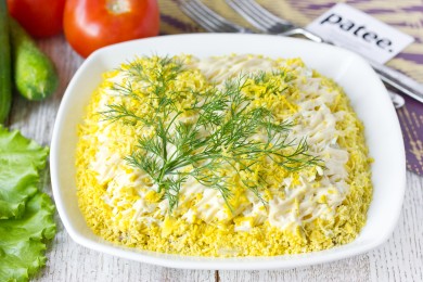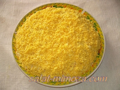 Мимоза – нежный и необычный салат. Внешне похож на цветки мимозы, которые разбросанные на белом снегу, поэтому великолепно смотрится на праздничном застолье.