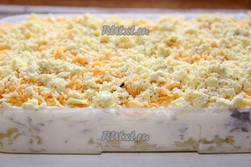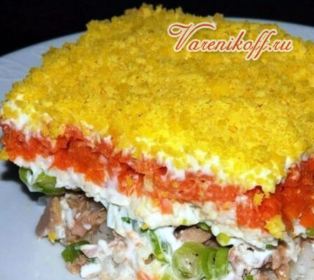 Процесс приготовления этого блюда не представляет сложностей. Как все многослойные салаты он должен пропитаться, так что лучше приготовить его с вечера.