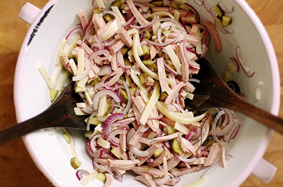Салат «Баварский», рецепт которого предлагает немецкая кухня, может быть подан на стол как праздничное блюдо и хорош к семейному ужину.