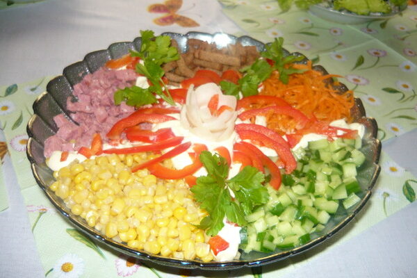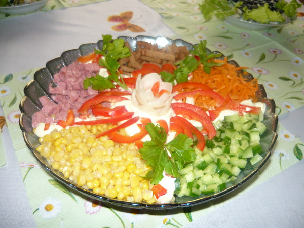 Заранее отвариваем мясо, остужаем, нарезаем соломкой. Томаты нарезаются кубиками, зеленый лук мелко крошится. Сладкий перец очищается и нарезается кубиками. Сыр натирается на терке. Мясо поливается майонезом, перемешивается и выкладывается ровным слоем на плоское блюдо. Сверху кладутся секторами все остальные овощи. В центре делается горка из майонеза. По рецепту салат калейдоскоп заранее не перемешивается, а делается это уже на праздничном столе.