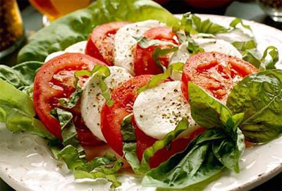 Сыр нарезается ломтиками. Помидоры моются, обсушиваются и нарезаются кружками. Соус для классического салата капрезе весьма прост: смешивается уксус бальзамический и оливковое масло (1:4). На сервировочной тарелке выкладываем внахлест, чередуя, помидоры, ломтики сыра и листья базилика. Польем это все приготовленной заливкой и немного поперчим. К классическому рецепту салата капрезе отлично подходит легкое столовое вино.