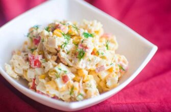 Богатый цветами и набором компонентов этот салат отлично подходит как дополнение к обеду, так и может служить полноценной заменой ужину. Здесь основное правило: не переесть. Нежно и вкусно в салате звучат крабовые палочки, которые удачно соединяются с другими продуктами.