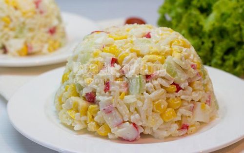 Вроде ничего такого особенного, но рис с огурцами подчеркивает вкус классического рецепта крабового салата. Это блюдо можно готовить по любым поводам, так как приготовление не составит особого труда и не займет много времени, но чаще его все таки подают на зимние праздники.
