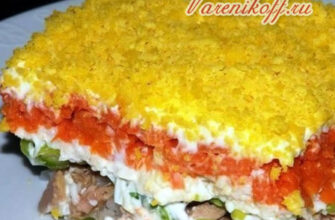 По рецепту салат курочка ряба выкладывается слоями, при чем каждый промазывается майонезом.1-й слой – куриное филе;2-й слой – лучок с грибами;3-й слой – тертые яйца;4-й слой – сыр.