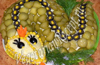1 слой – натертый картофель и красная икра;2 слой – кальмары и красная икра;3 слой – белки и красная икра;4 слой – кубики крабовых палочек;5 слой – желтки;6 слой – сыр.