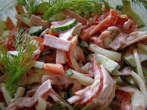 Классической заправкой для салатов с ветчиной является майонез, но вместо него можно взять сметану или кефир. Обычный помидор можно заменить на черри, тогда блюдо станет намного аппетитнее.
