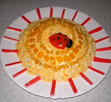Готово, но ему нужно дать настояться. 1 час в холодильнике – вполне достаточно. Как видите, салат Солнышко (рецепт которого очень прост) – один из отличных вариантов разнообразить свою трапезу.