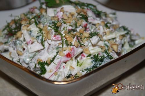 Этот салат принадлежит к серии рецептов «на скорую руку», т.к. в нем присутствуют обычные и доступные продукты. Еще его преимущество в том, что здесь задействованы свежие овощи и ничего не нужно отваривать. Хозяйку на кухне он долго не задержит, а гости удивятся пикантному вкусу.
