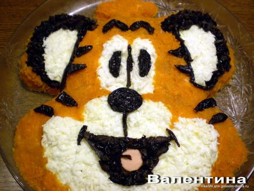 1 слой – картофель (посолить, поперчить и придать форму тигриной головы);2 слой – вареная колбаса;3 слой – огурцы (если свежие немножко посолить);4 слой – лук c яйцами;5 слой – морковь.