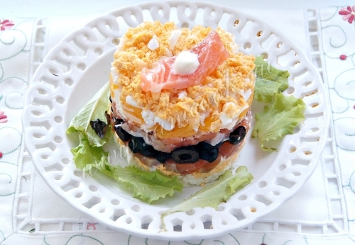 Завершающий слой – остатки измельченного белка, смазанные майонезом. Снимаем формовочное кольцо и украшаем оставшимся желтком и кусочком рыбы.