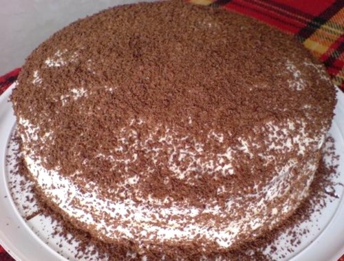 Берём готовый корж и промазываем его кремом. Сверху я посыпала ещё молотые грецкие орехи.
